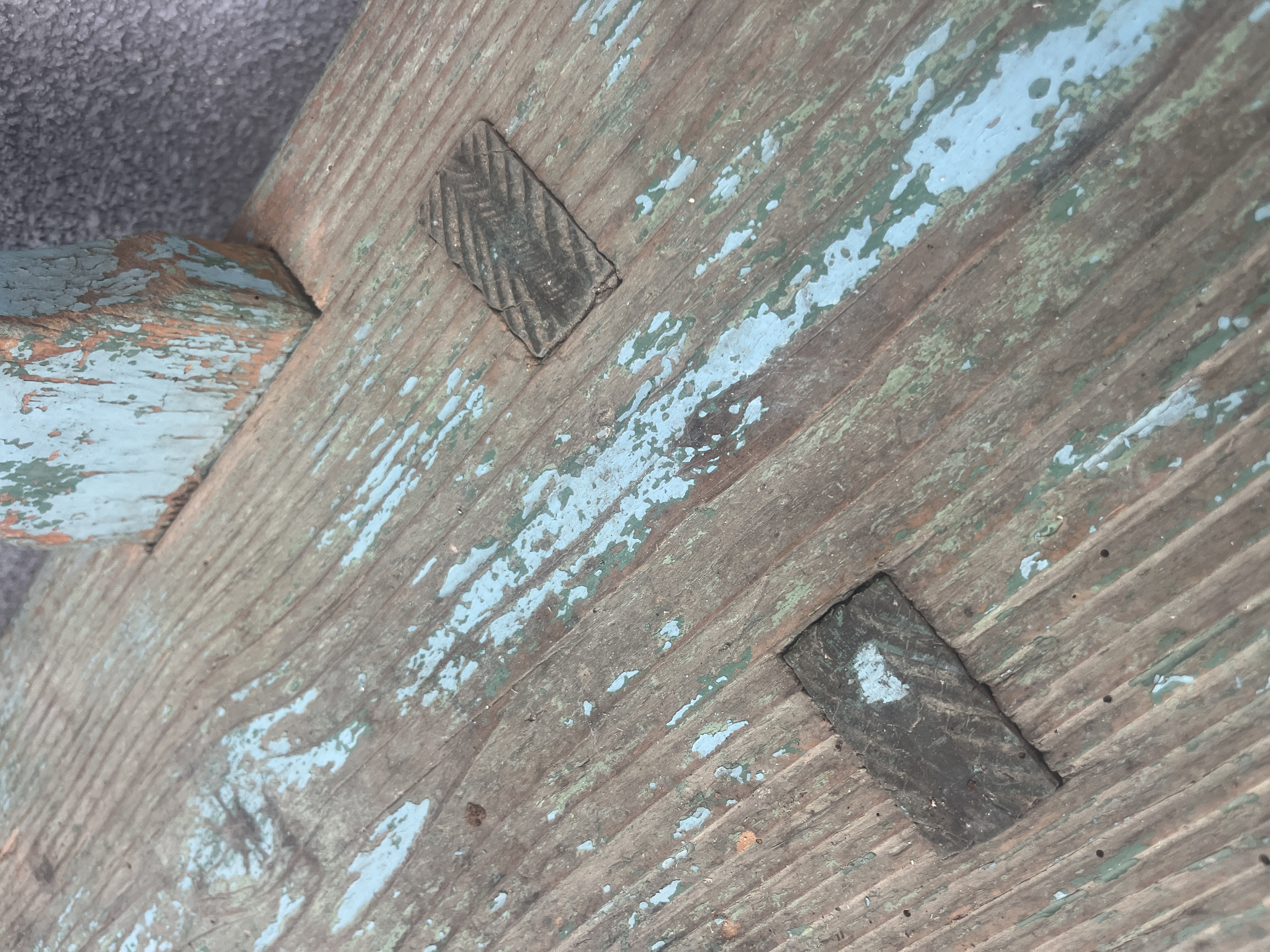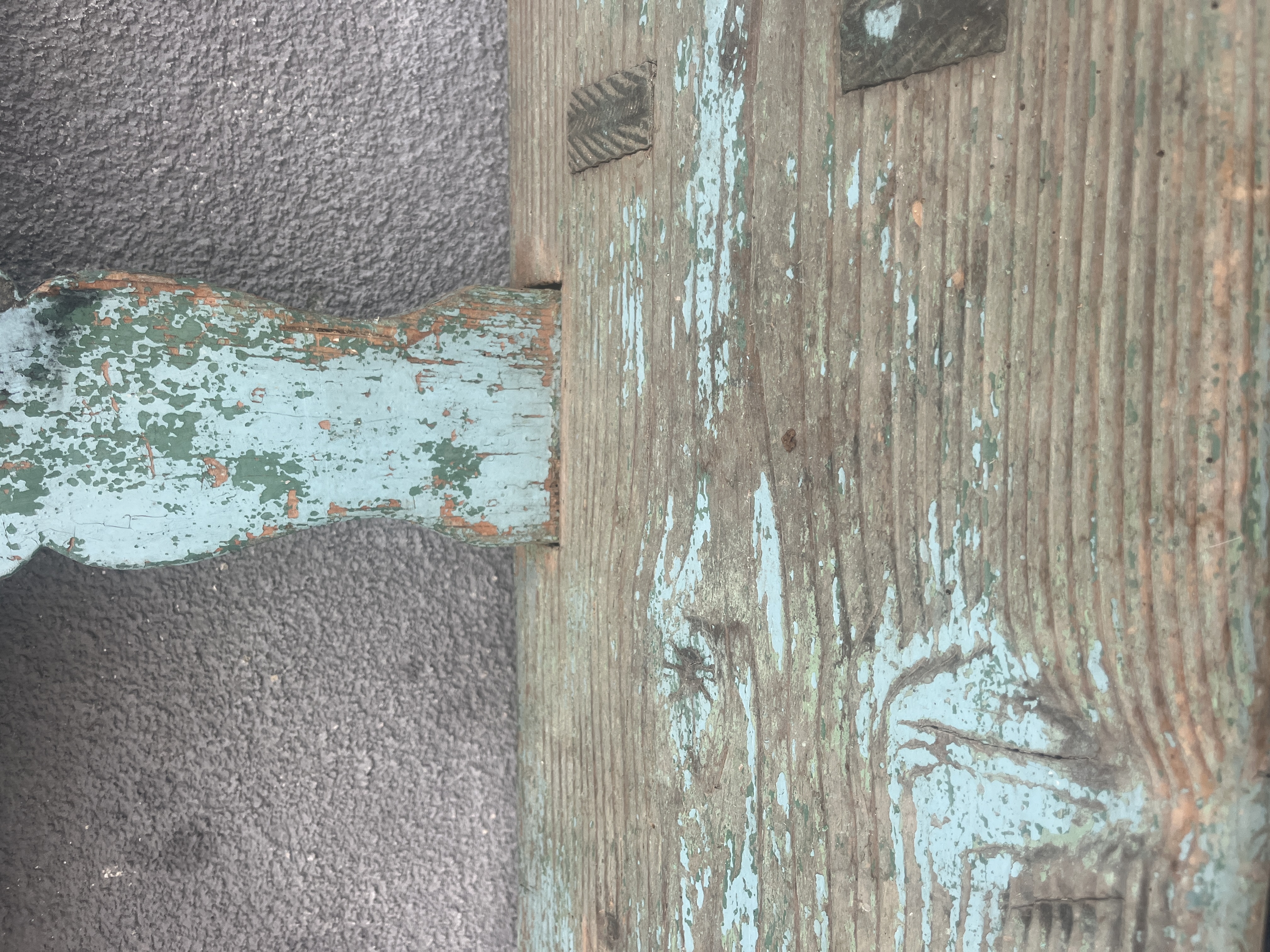 Banc ancien en sapin, à la patine vert mint d’origine, marqué par le temps et l’usage.