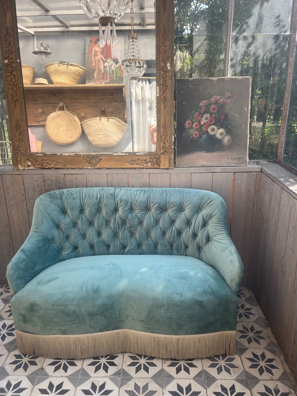 Canapé crapaud ancien – retapissé en velours bleu-vert