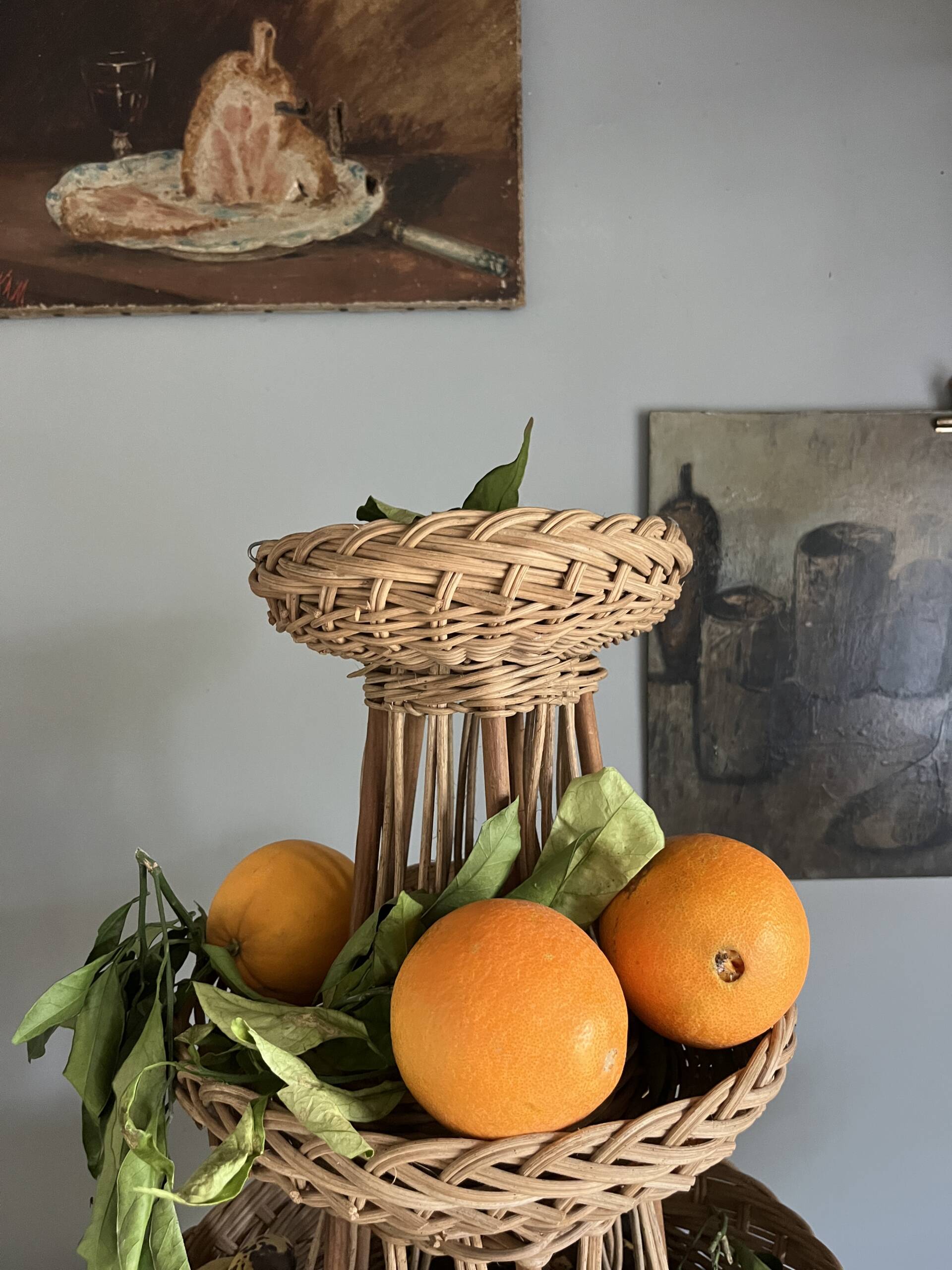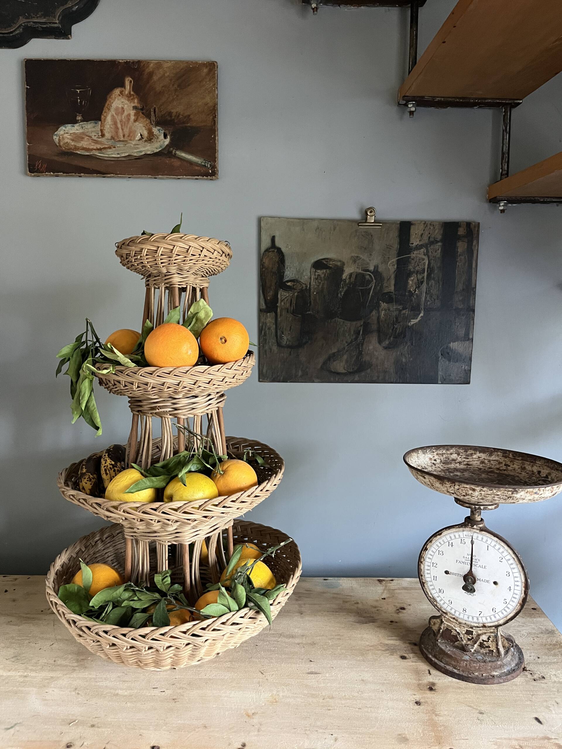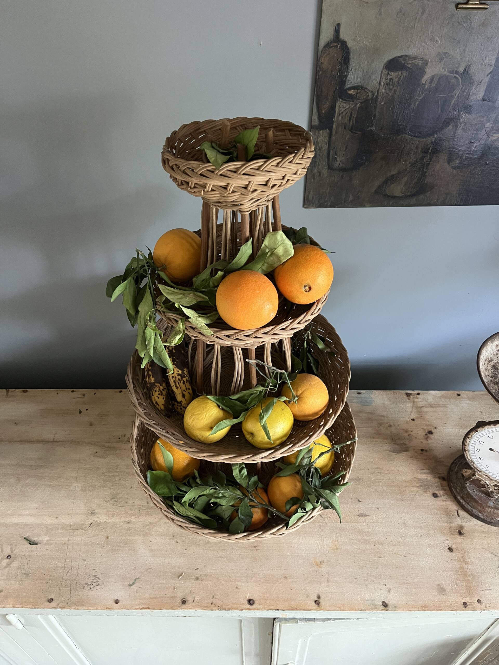 Superbe et rare grande panière ancienne en rotin tressé, à trois niveaux.