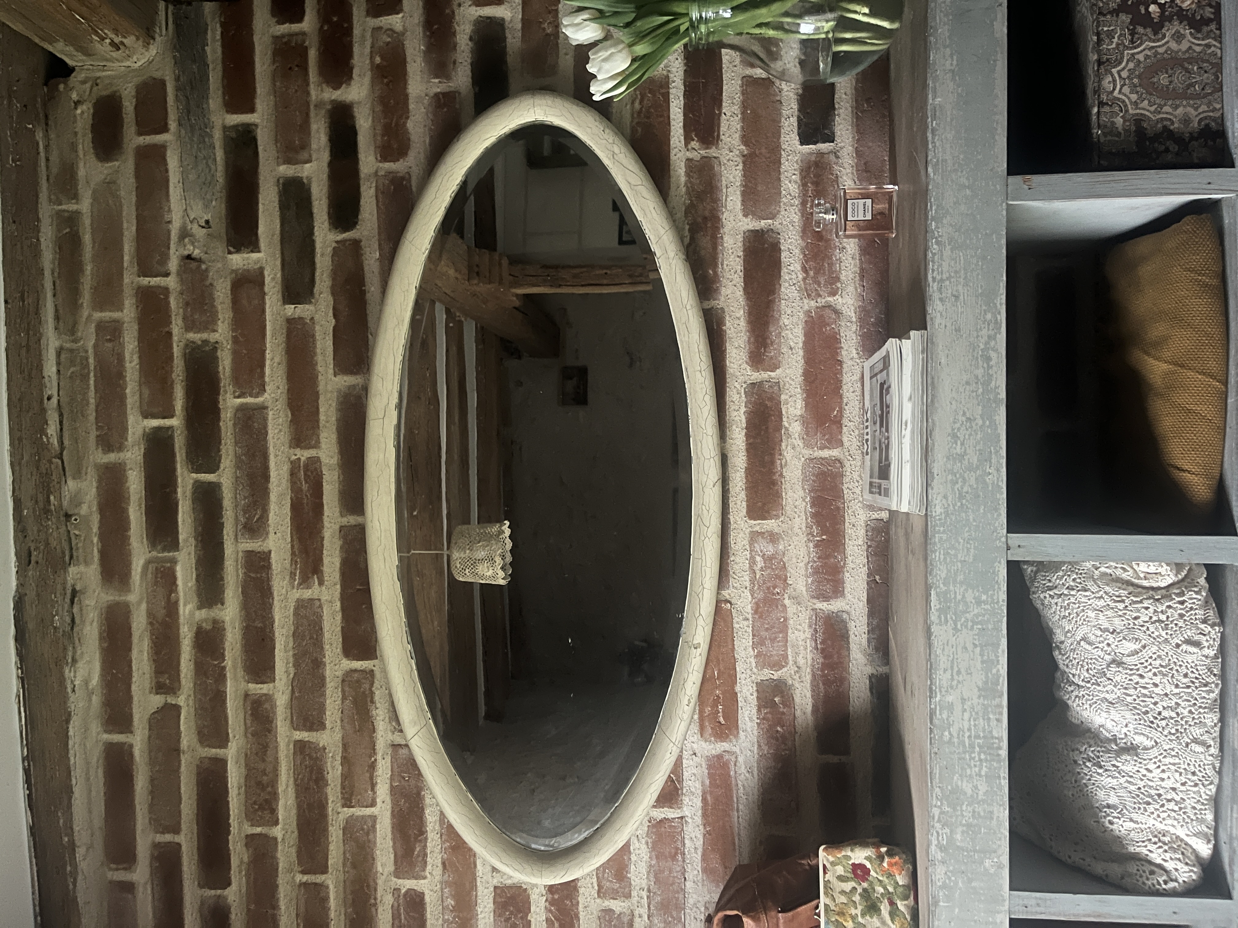 Miroir ancien de forme ovale, biseauté, avec cadre en bois crème.