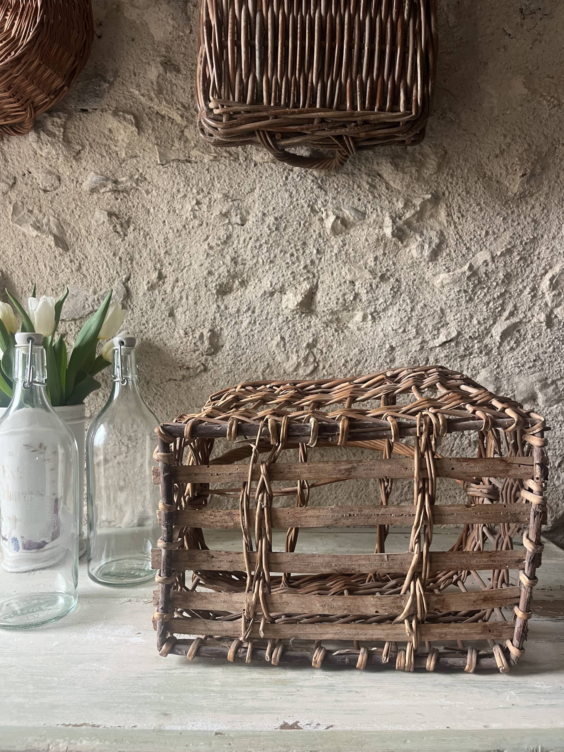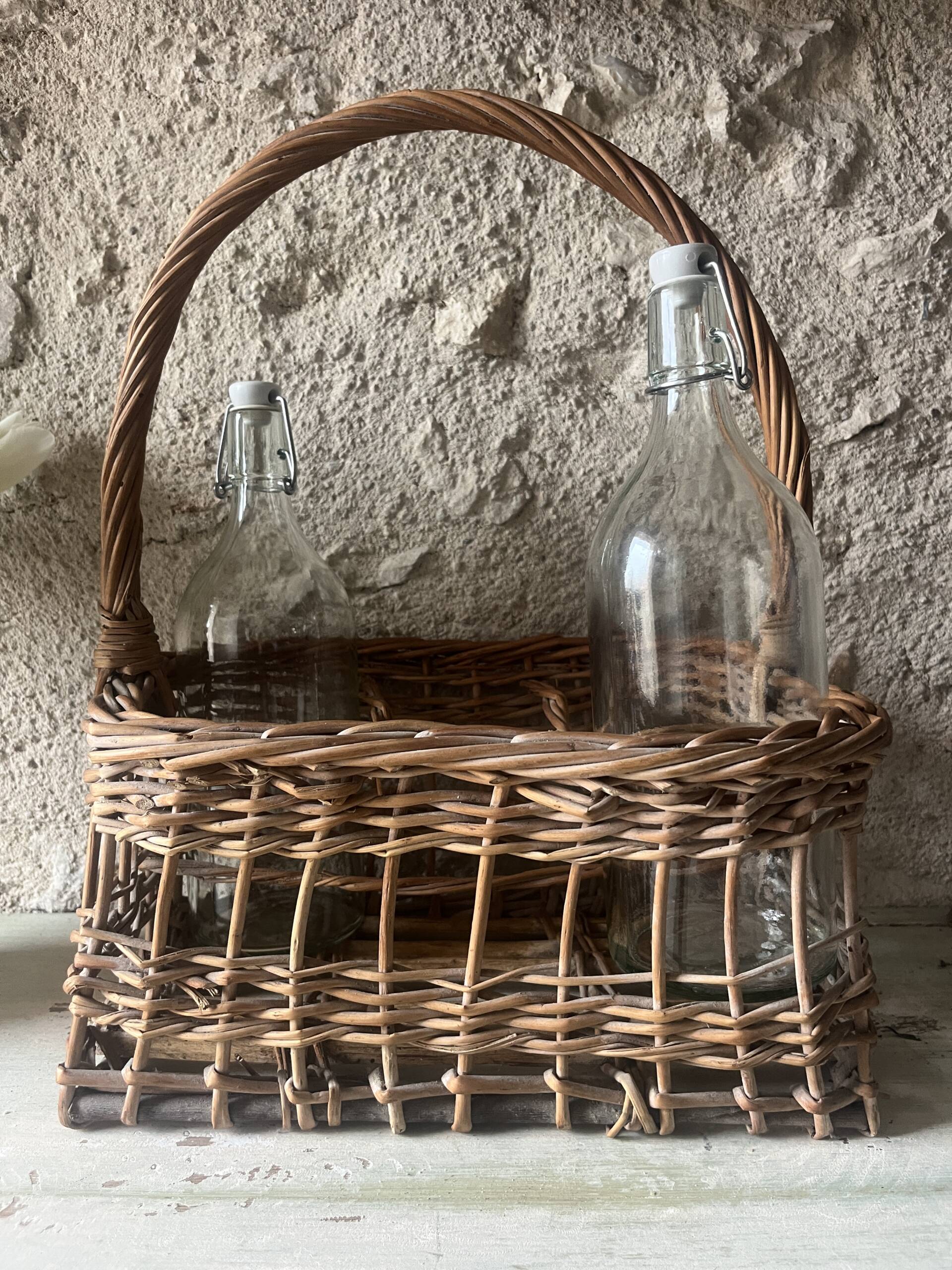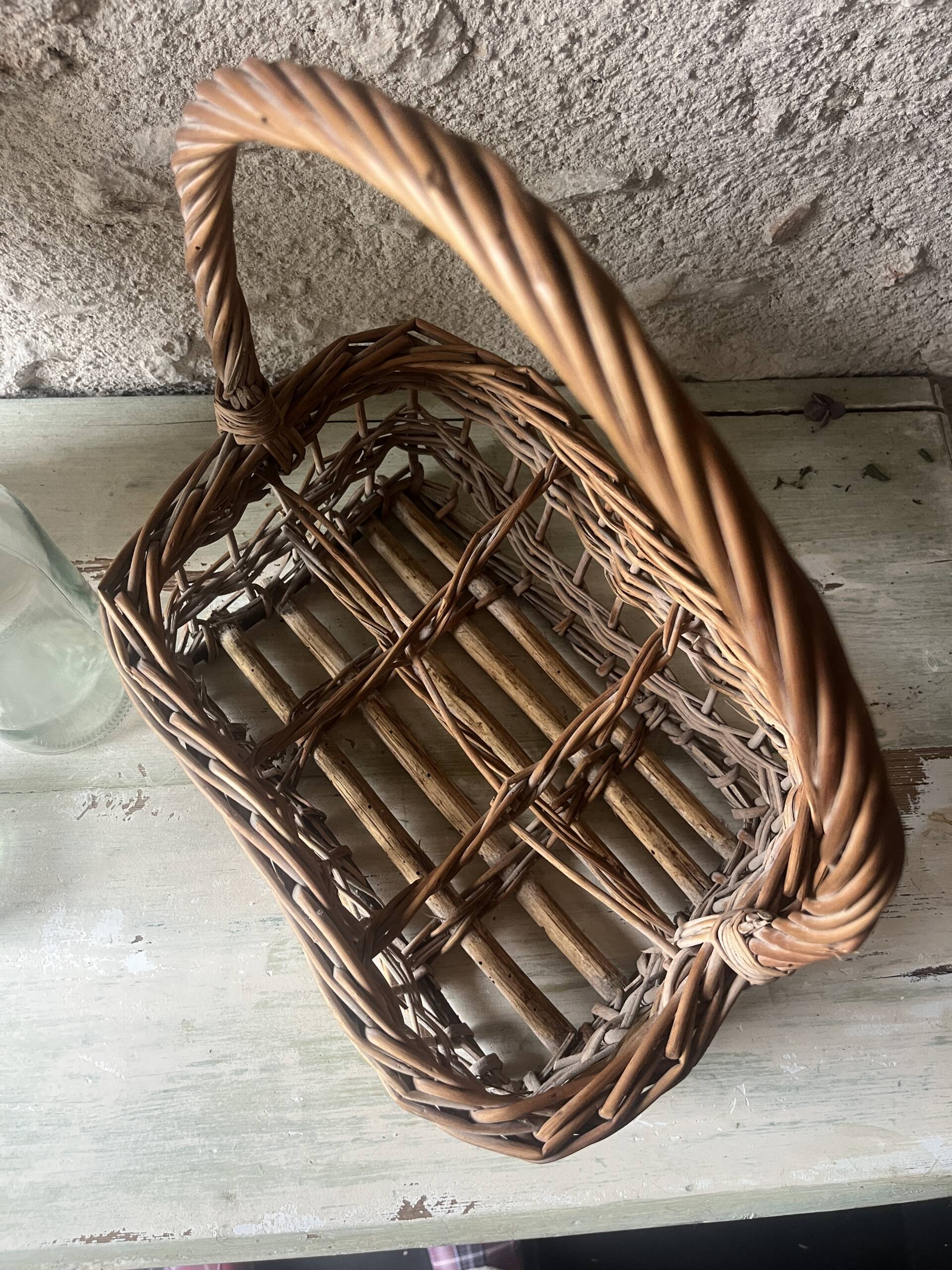 Porte-bouteilles / panier ancien en osier avec anse torsadée, pour 6 bouteilles.