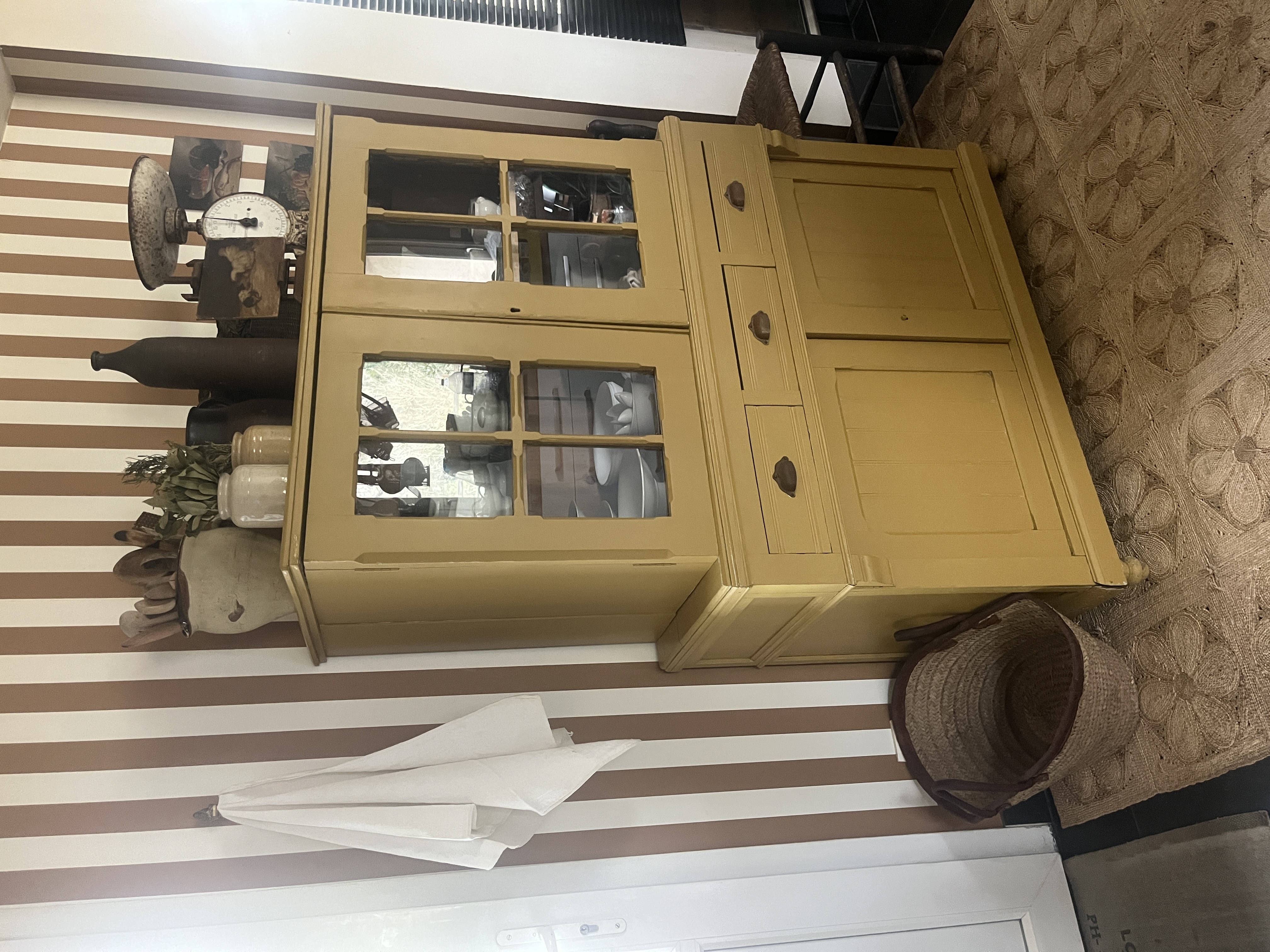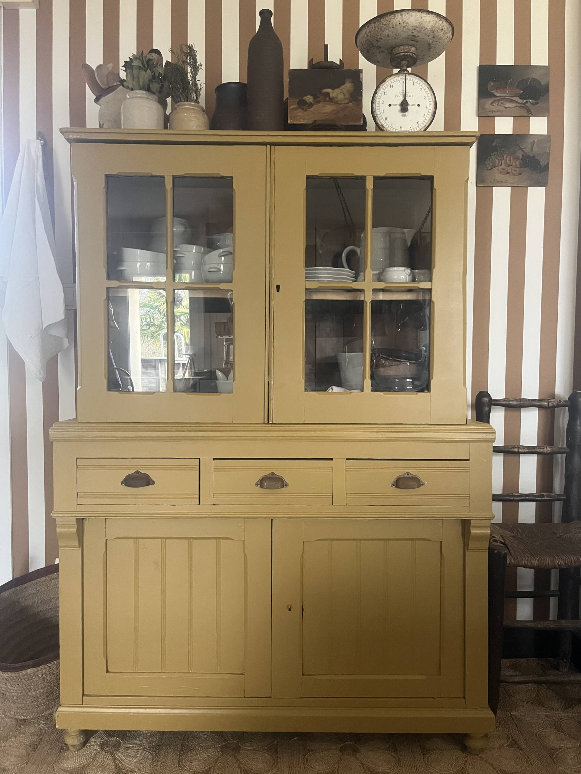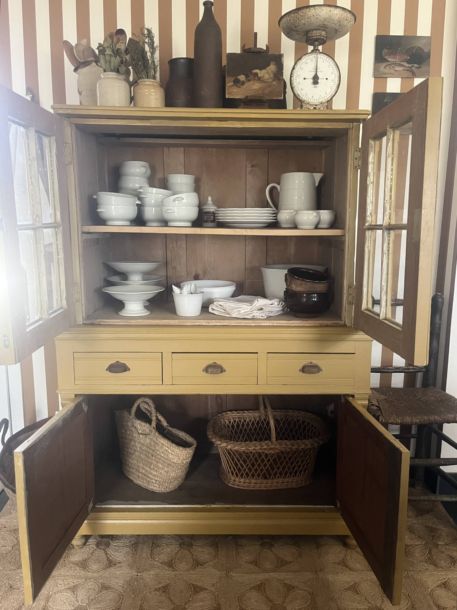 Ancien vaisselier de cuisine composé de deux éléments indépendants, peint dans une teinte ocre chaleureuse à la patine douce.
