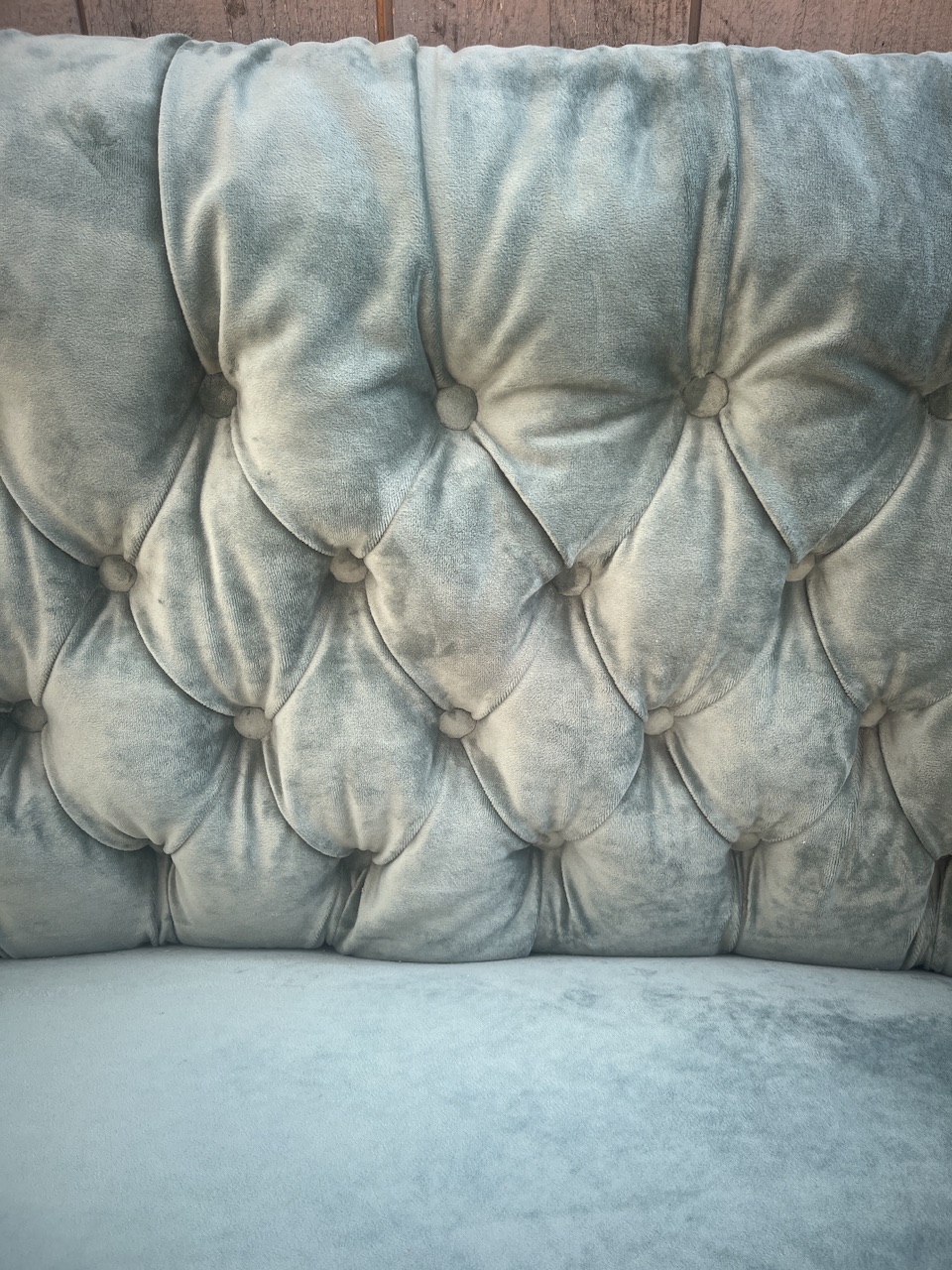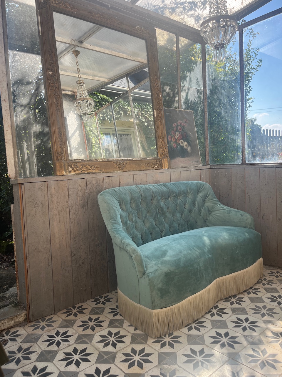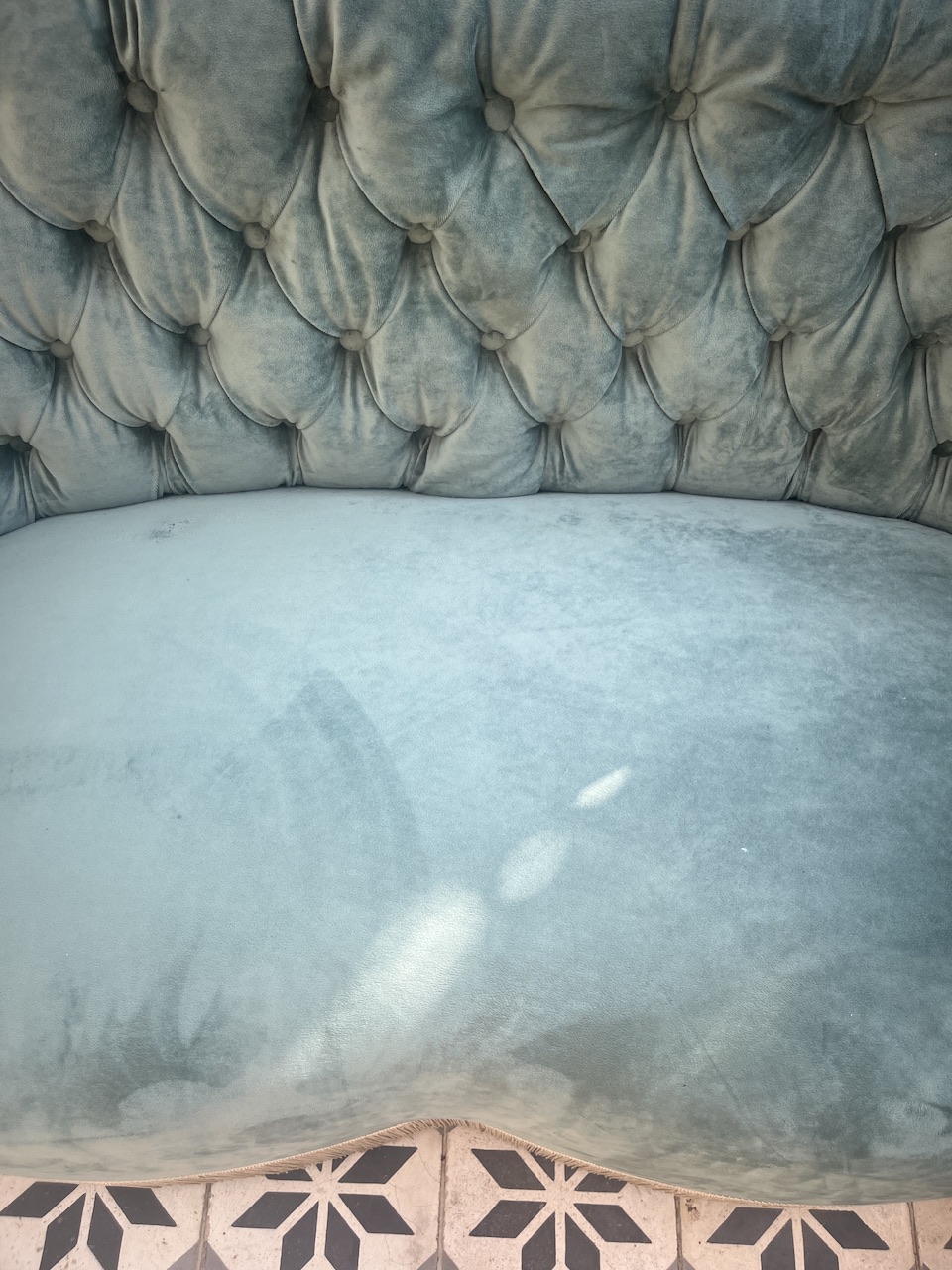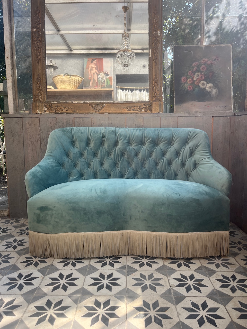 Canapé crapaud ancien – retapissé en velours bleu-vert