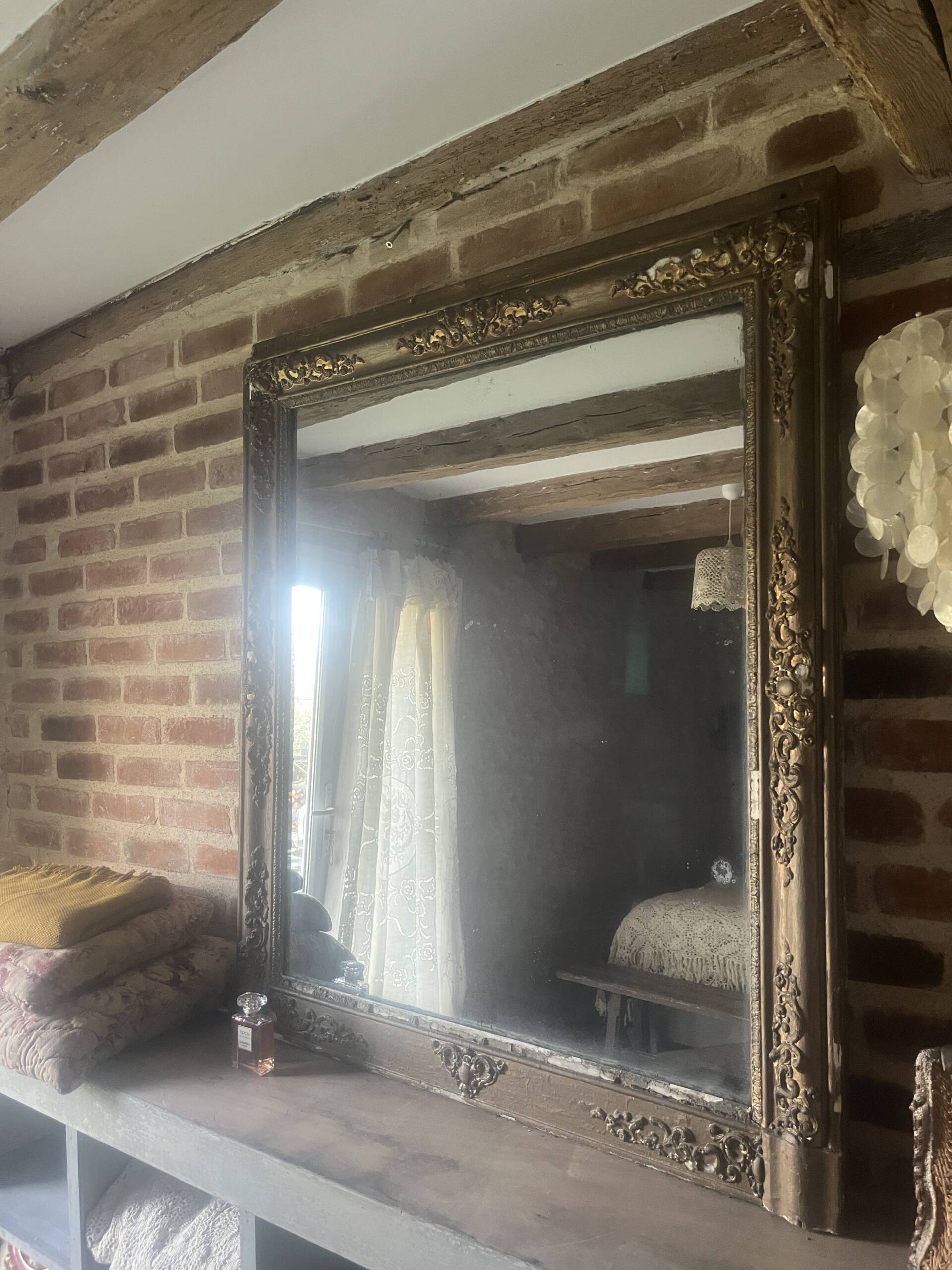 Miroir piqué, cadre très marqué par le temps, avec manques visibles.