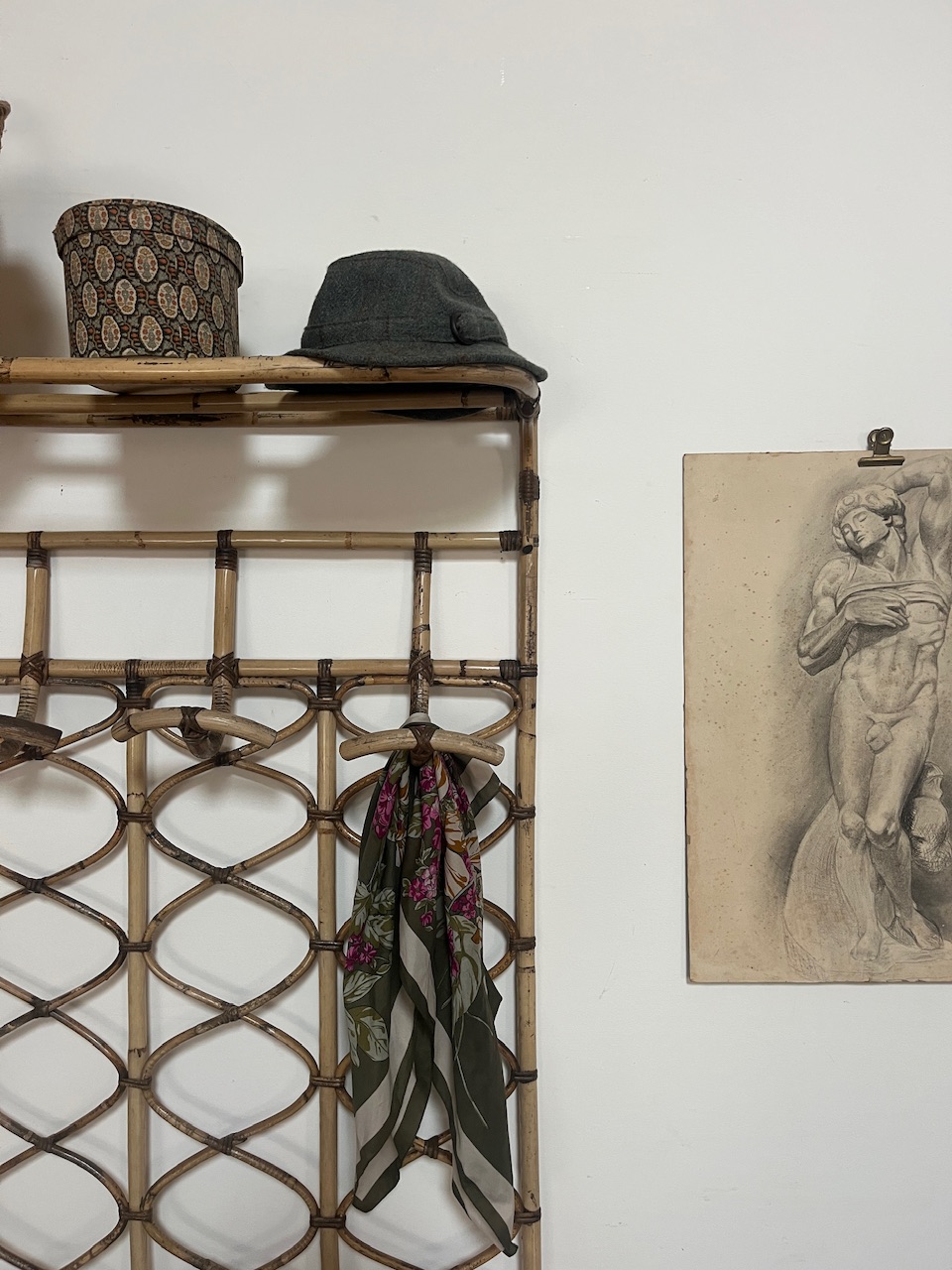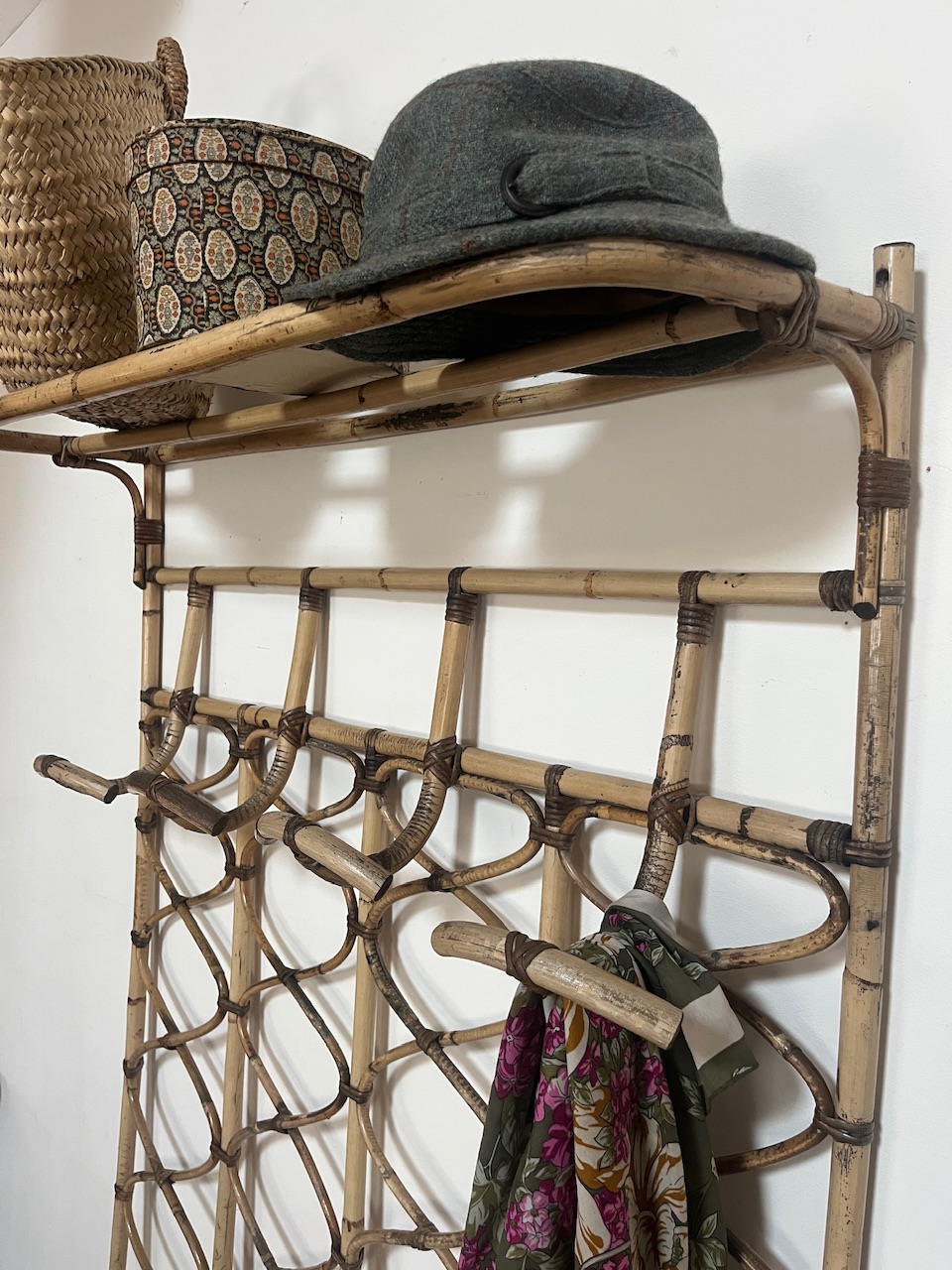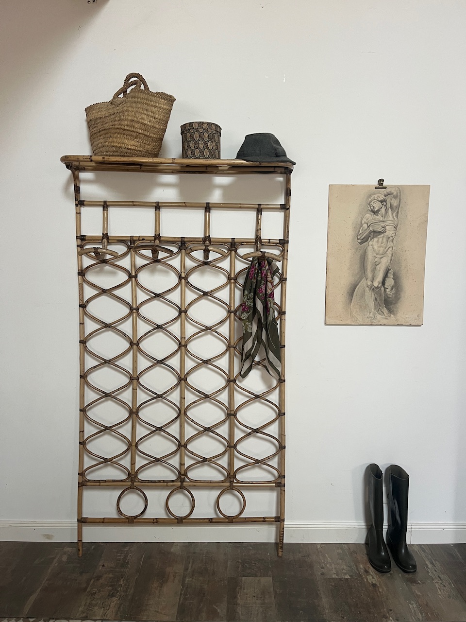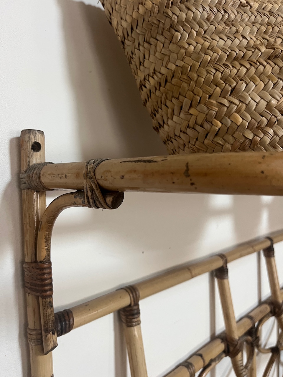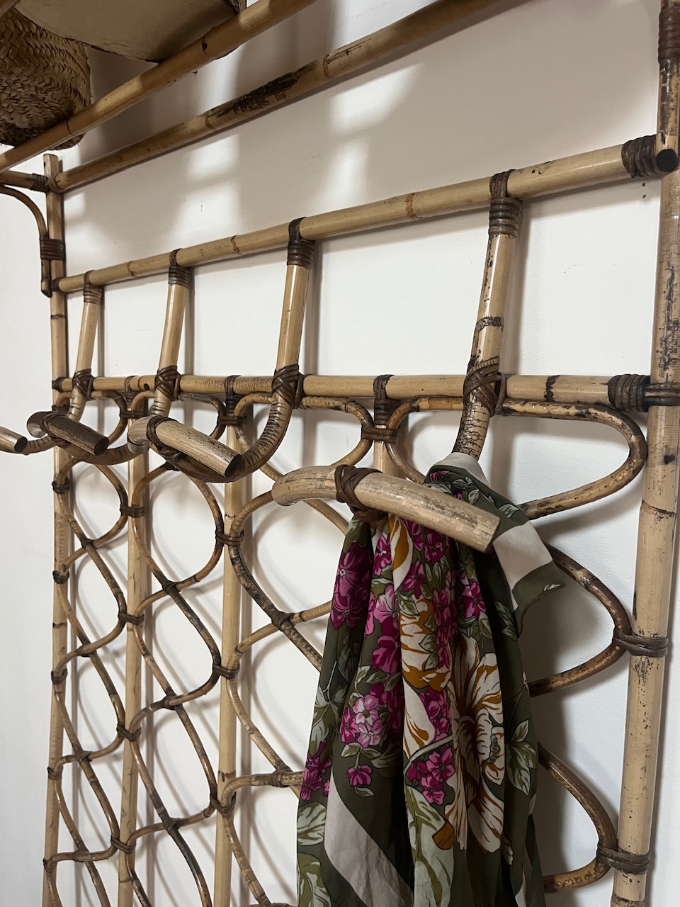 Porte-manteau mural en rotin cintré, typique du design italien des années 60.